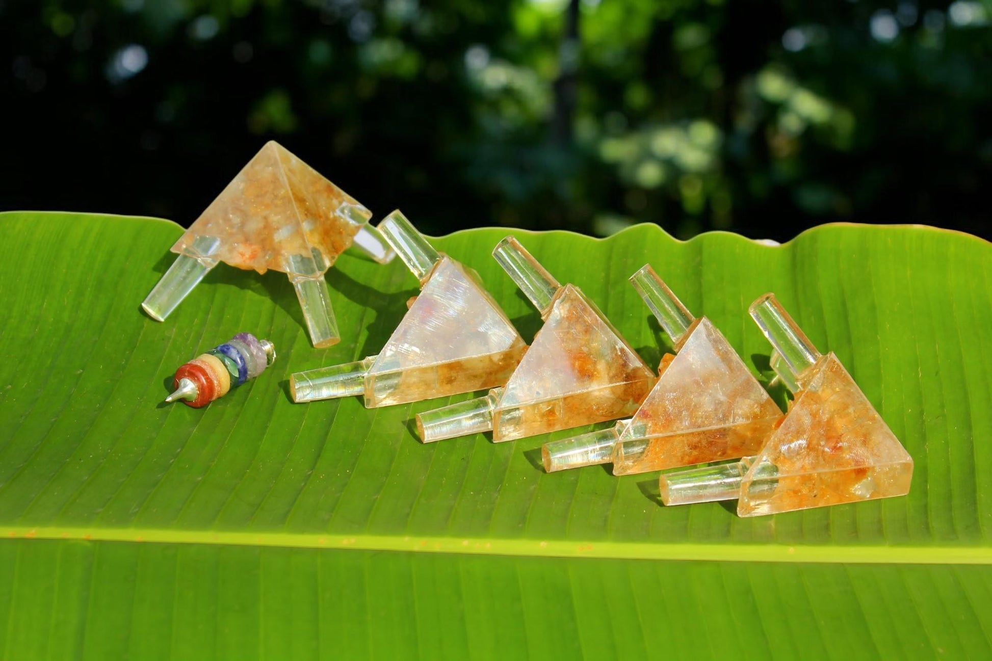 This orgonite/orgon Meditation Pyramid connector kit is for those who want to save on shipment on complete set of pyramid and who have access to copper/brass or aluminum 12 MM outer diameter pipe which can be obtained in the hardware store neat you. with it you will get 5 corner connectors. we can make customize kit of any size of your choice of pipes as well and with any natural crystals. which is not shown in the drop down manu with this kit you will get one hanging 7 chakra pendant to hand in the apex of the top corner connector which will multiples and equally distribute the energy within the pyramid. this pyramid is exact replica of the Giza pyramid at Gaza and it's very precise made of 51.51° slope angles. with this connector kit, you can build up to a 5,6,7 feet base pyramid. This pyramid can be assembled and disassembled within 5 to 10 minutes without any additional tools. This makes these powerful personal tools the base meditation pyramid to achieving deep meditative states and accelerating healing on the spiritual, mental, and physical levels. to make this connectors mold we used laser cutting disposable molds which is very precise and accurate and to make the orgonite we used ultra clear clear epoxy so it won't turn yellow. we use natural unpolished AAA grade crystals to for filling. as this is all natural and the energy of the pyramid can be measured with negative ion meter once the pyramid is assembled.