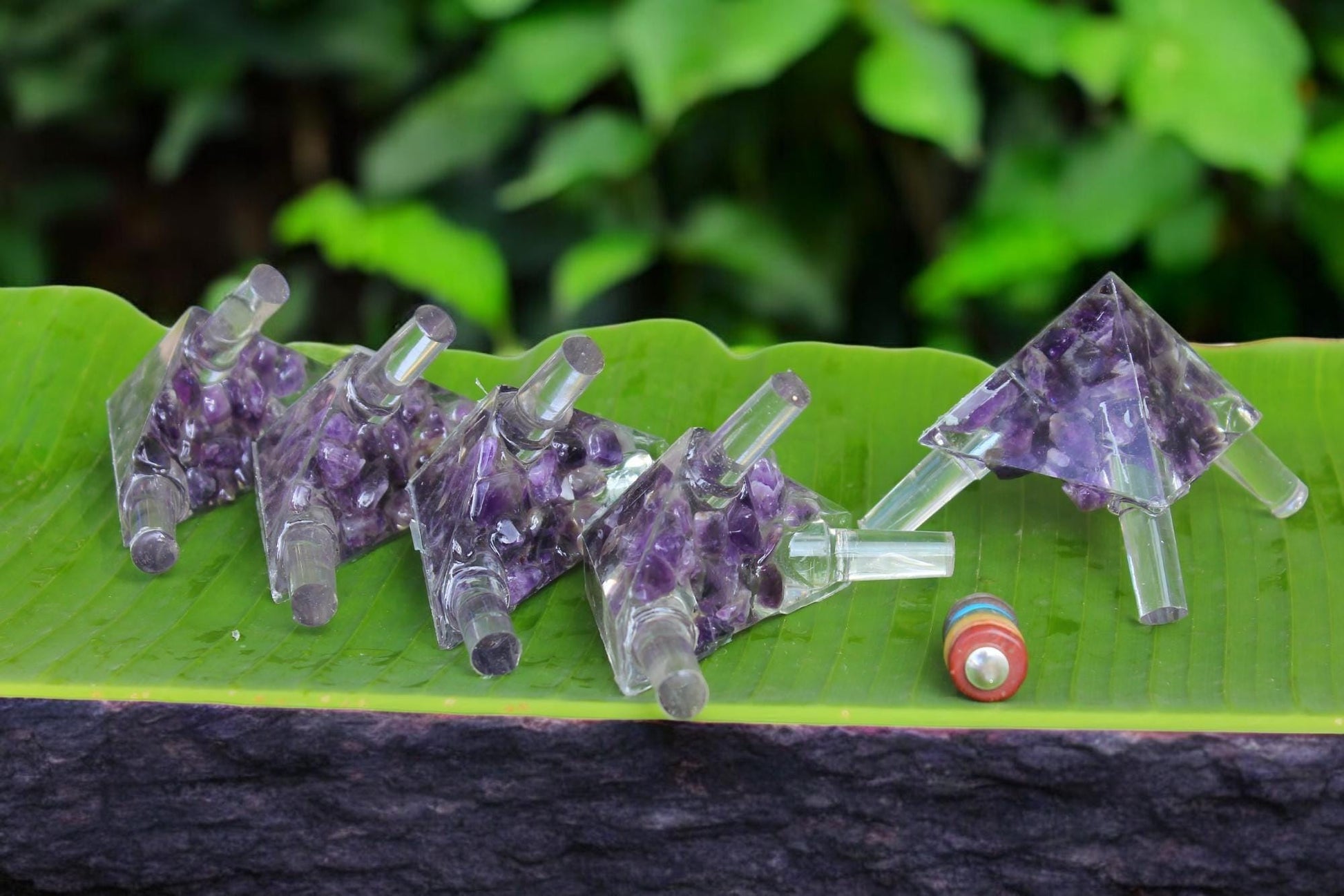 This orgonite/orgon Meditation Pyramid connector kit is for those who want to save on shipment on complete set of pyramid and who have access to copper/brass or aluminum 14 MM outer diameter pipe which can be obtained in the hardware store neat you. with it you will get 5 corner connectors. we can make customize kit of any size of your choice of pipes as well and with any natural crystals. which is not shown in the drop down manu with this kit you will get one hanging 7 chakra pendant to hand in the apex of the top corner connector which will multiples and equally distribute the energy within the pyramid. this pyramid is exact replica of the Giza pyramid at Gaza and it's very precise made of 51.51° slope angles. with this connector kit, you can build up to a 5,6,7 feet base pyramid. This pyramid can be assembled and disassembled within 5 to 10 minutes without any additional tools. This makes these powerful personal tools the base meditation pyramid to achieving deep meditative states and accelerating healing on the spiritual, mental, and physical levels. to make this connectors mold we used laser cutting disposable molds which is very precise and accurate and to make the orgonite we used ultra clear clear epoxy so it won't turn yellow. we use natural unpolished AAA grade crystals to for filling. as this is all natural and the energy of the pyramid can be measured with negative ion meter once the pyramid is assembled.